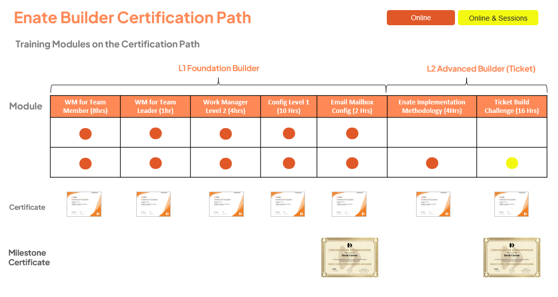 <table data-header-hidden><thead><tr><th width="140" valign="top"></th><th width="107" valign="top"></th><th valign="top"></th></tr></thead><tbody><tr><td valign="top"><strong>Course</strong></td><td valign="top"><strong>Duration</strong></td><td valign="top"><strong>What it covers</strong></td></tr><tr><td valign="top">Work Manager for Team Members</td><td valign="top">8 hrs</td><td valign="top">Operations features within Work Manager – managing Tickets, Cases &#x26; Actions</td></tr><tr><td valign="top">Work Manager for Team Leaders</td><td valign="top">1 hr</td><td valign="top">Team Leader-specific activities – building teams, reassigning work</td></tr><tr><td valign="top">Level 1 Enate Configuration</td><td valign="top">10 hrs</td><td valign="top">Core principles of Enate Builder – creating and maintaining Ticket &#x26; Case processes, users, permissions, custom fields</td></tr><tr><td valign="top">Work Manager Level 2</td><td valign="top">4 hrs</td><td valign="top">Wider Work Manager feature set, building familiarity ahead of later User Guidelines creation</td></tr><tr><td valign="top">Email Mailbox Configuration</td><td valign="top">2 hrs</td><td valign="top">Connecting mailboxes to consume inbound email and create Work Items; outbound email setup</td></tr></tbody></table>