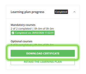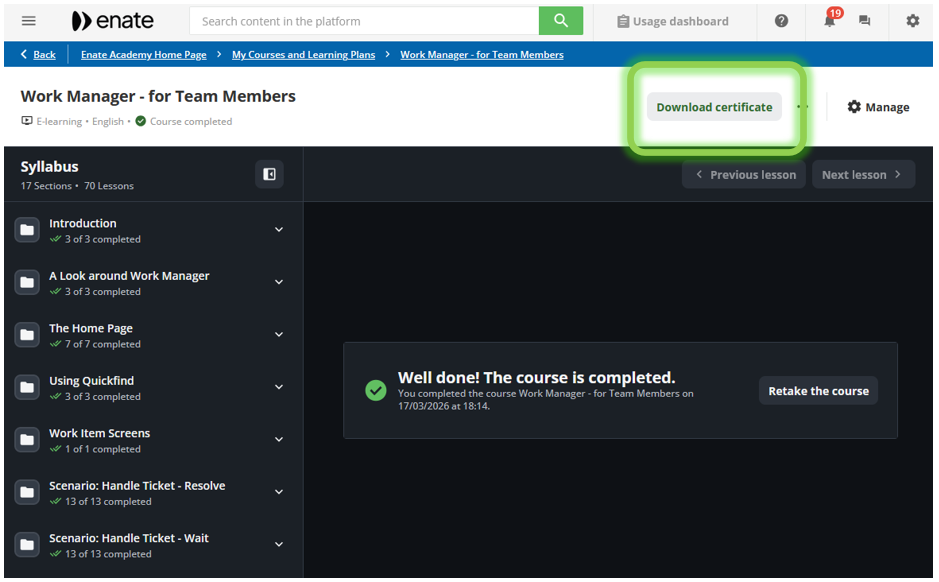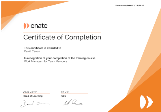 The certificate is also permanently available within the trainee's learning plan on Enate Academy, and from within each individual course. Individual course completion certificates are issued at the end of each course.