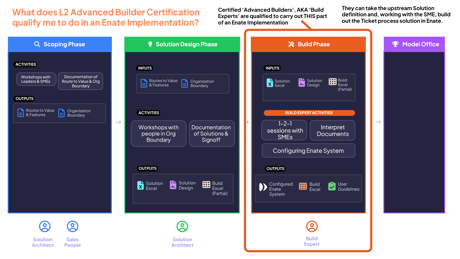 An L2 Advanced Builder (also referred to as a Build Expert) is qualified to take the outputs of a Solution Design phase and, working directly with Subject Matter Experts (SMEs), build out a complete Ticket process solution in Enate. This is the core hands-on role in the Build phase of an Enate implementation.&#x20;