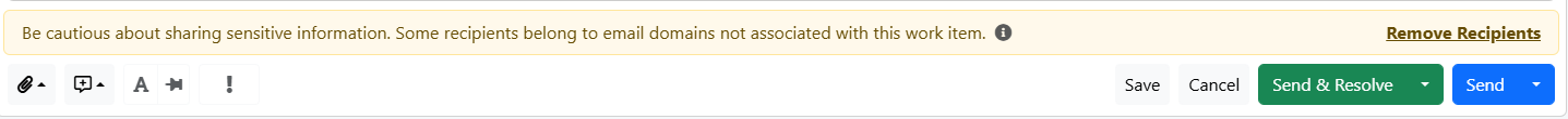 Pentru a proteja informațiile sensibile, în cazul în care o adresă de destinatar care nu este asociată cu un Articol de Lucru este introdusă într-un e-mail dintr-un Articol de Lucru, va apărea un mesaj de avertizare care vă va atenționa cu privire la faptul că o adresă de e-mail nu este asociată cu Articolul de Lucru și vă va oferi opțiunea de a elimina orice adresă de e-mail neasociată. Dacă doriți totuși să trimiteți e-mailul destinatarului ales, faceți clic pe trimite.