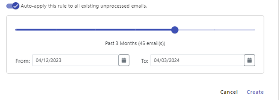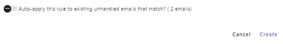В дополнение к настройкам правила, которое будет применяться ко всем будущим емейлам, соответствующим этом паттерну, Вы также можете выбрать опцию применить это правило по отношению ко всем/некоторым существующим необработанным емейлам, которые соответствуют этому правилу. Чтобы эту настройку применить, включите переключатель "Автоприменение", расположенный в нижней части этого всплывающего окна.