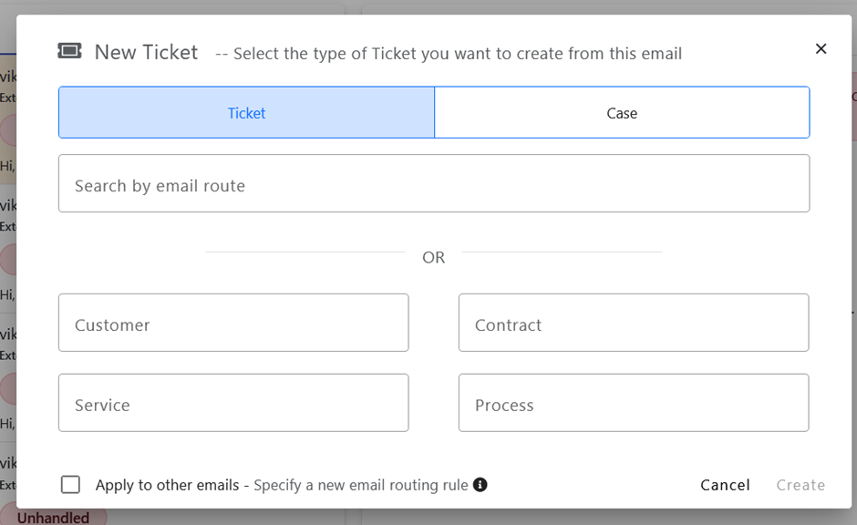 Вы можете провести поиск по маршруту емейла (это автоматически заполнит поля по Клиенту/Контракту/Услуге/Процессу, основываясь на предложениях для выбранного адреса почтового ящика), или же Вы можете вручную выбрать. Если на этом этапе Вы нажмете на кнопку "Создать", то будет, как обычно, создана Заявка или Случай из этого емейла.