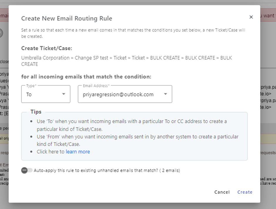 * Дальше появится еще одно всплывающее окно для "Создания нового правила маршрутизации емейла", в котором Вы сможете заполнить оставшиеся детали для правила маршрутизации перед тем, как Вы сможете подтвердить его создание.