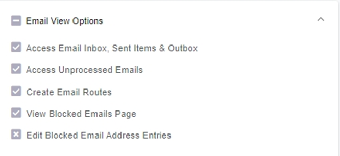Функция доступа для возможности создания новых маршрутов емейлов в Менеджере работ управляется через систему пользовательских ролей Enate, с новой добавленной опцией в секцию Опций просмотра емейлов.