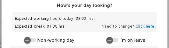 * **Today -** what their working hours and break is for today, plus if they have any non-core work activities planned.