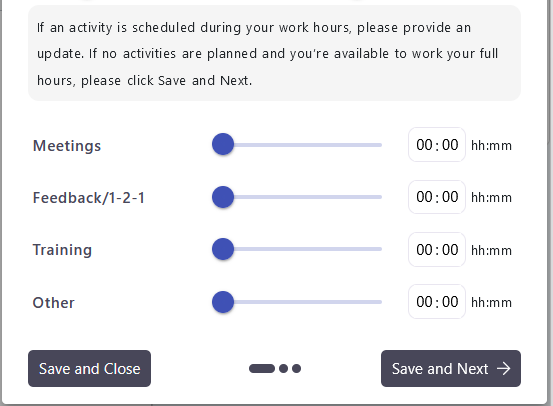 Instead, this is where you enter that e.g. you know you've got 2 hours of meetings today, so your Team Leader will know that of the 7 working hours left in your day after breaks, only 5 of them can be time available to actively work.