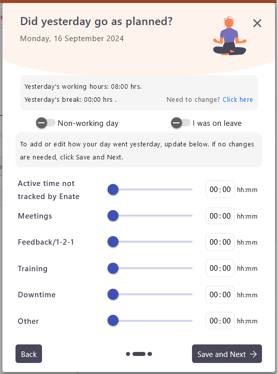 At any point users can click back to the popup to adjust data enetered for today, yesterday & tomorrow, and can access the [Main Insights Page](https://docs.enate.net/enate-help/work-manager/work-manager-2021.1/user-availability-insights/main-insights-page).