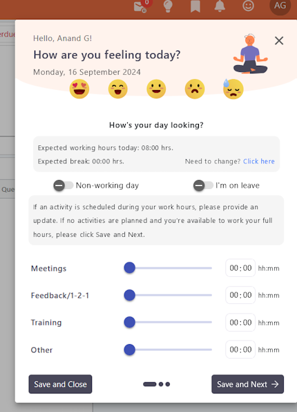 If they click 'Save and Close', they are done and the system will mark their mandatory Insights data as filled in for that day. Clicking 'Save & Next'