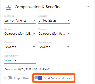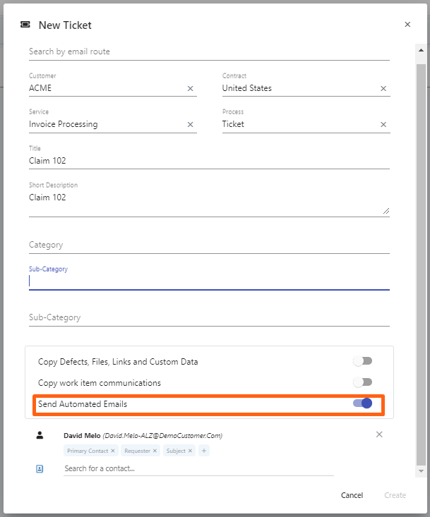 Wenn Sie ein Ticket von der Kontaktaktivitätsseite aus starten, ist die Option "Automatisierte E-Mails senden" jetzt standardmäßig ausgeschaltet, aber Sie können sie auf dem Ticket-Bildschirm manuell einschalten.