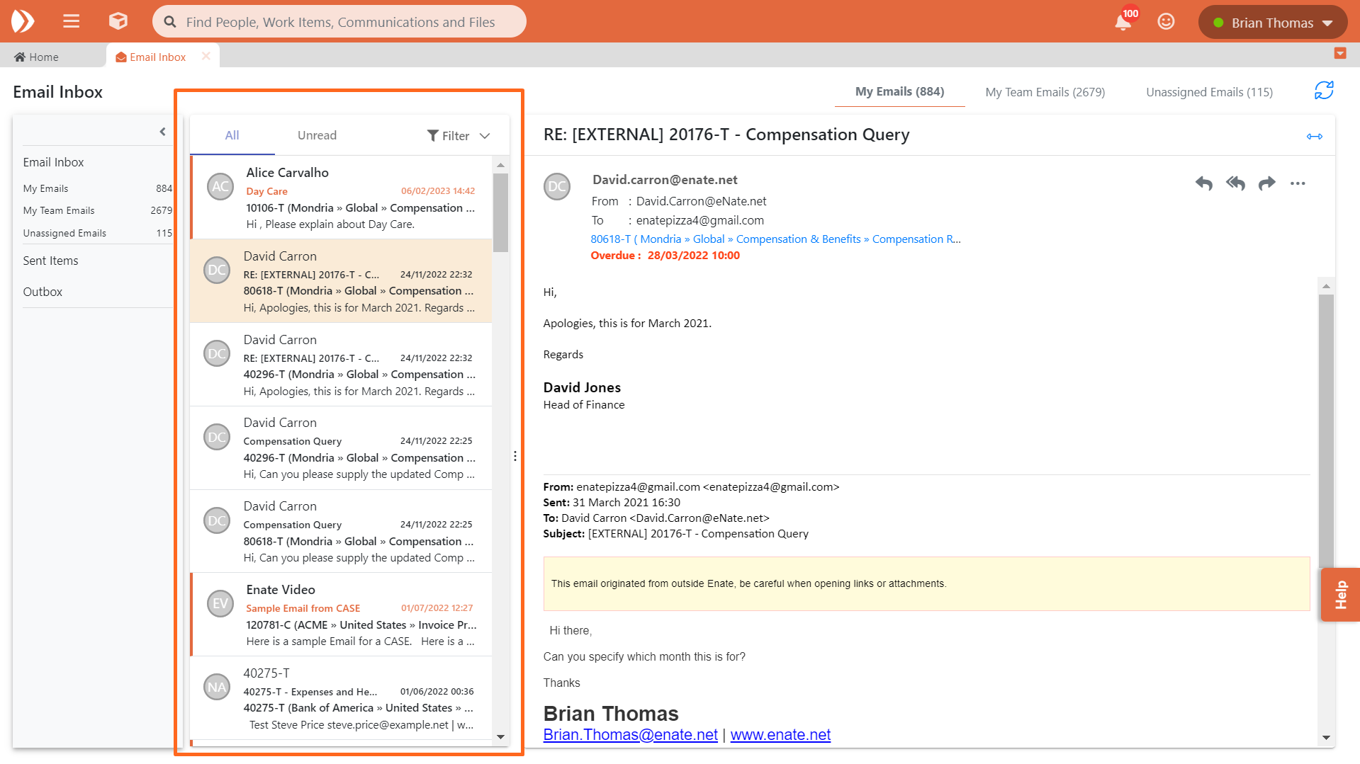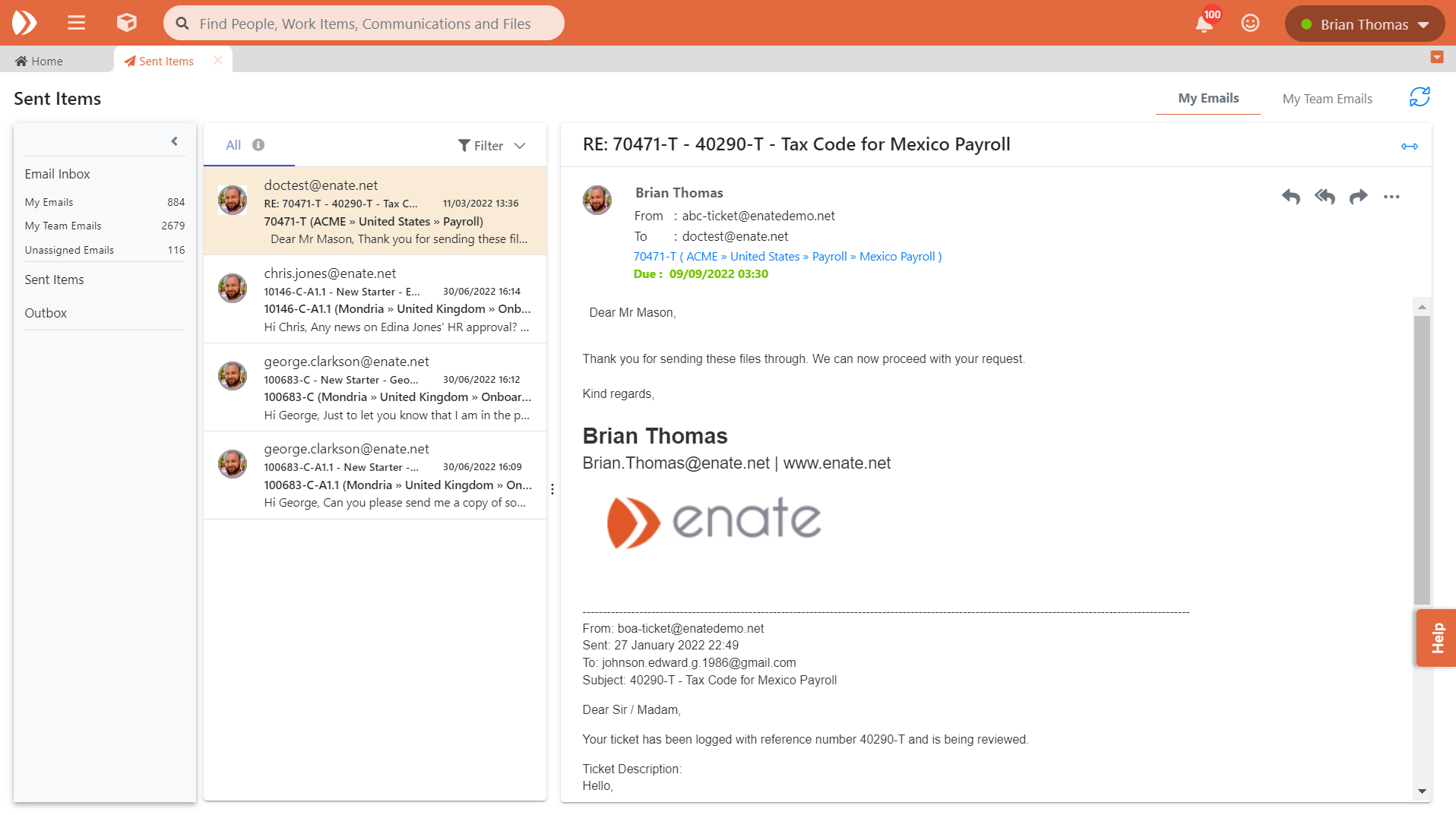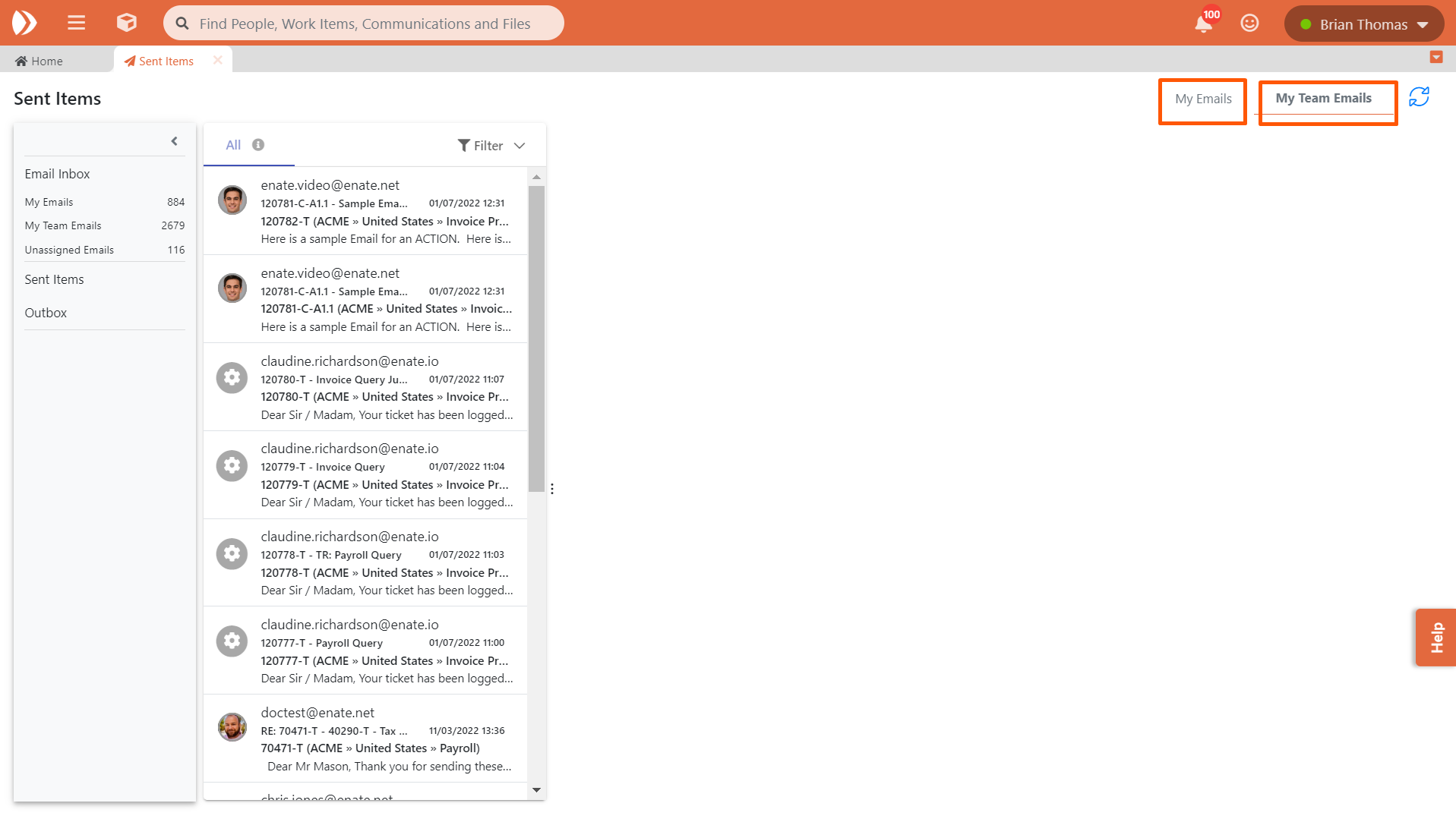 Nous avons apporté des améliorations significatives à la façon dont vous pouvez travailler avec les e-mails dans Enate en créant un tout nouvel ensemble de vues des e-mails. Elles se basent sur les vues existantes de la Boîte d'envoi pour vous donner une liste plus complète de tous les e-mails qui concernent votre domaine d'activité :
