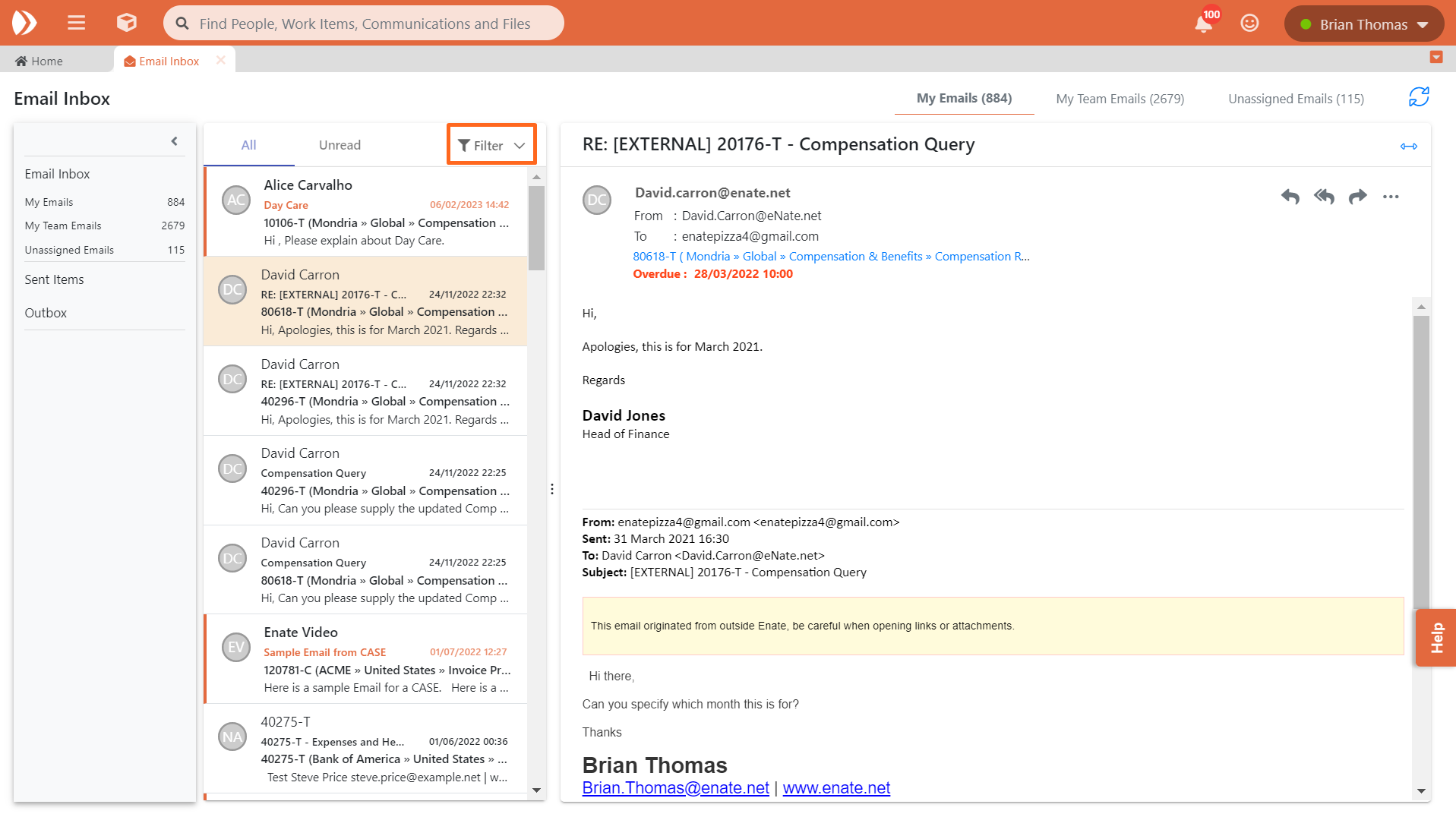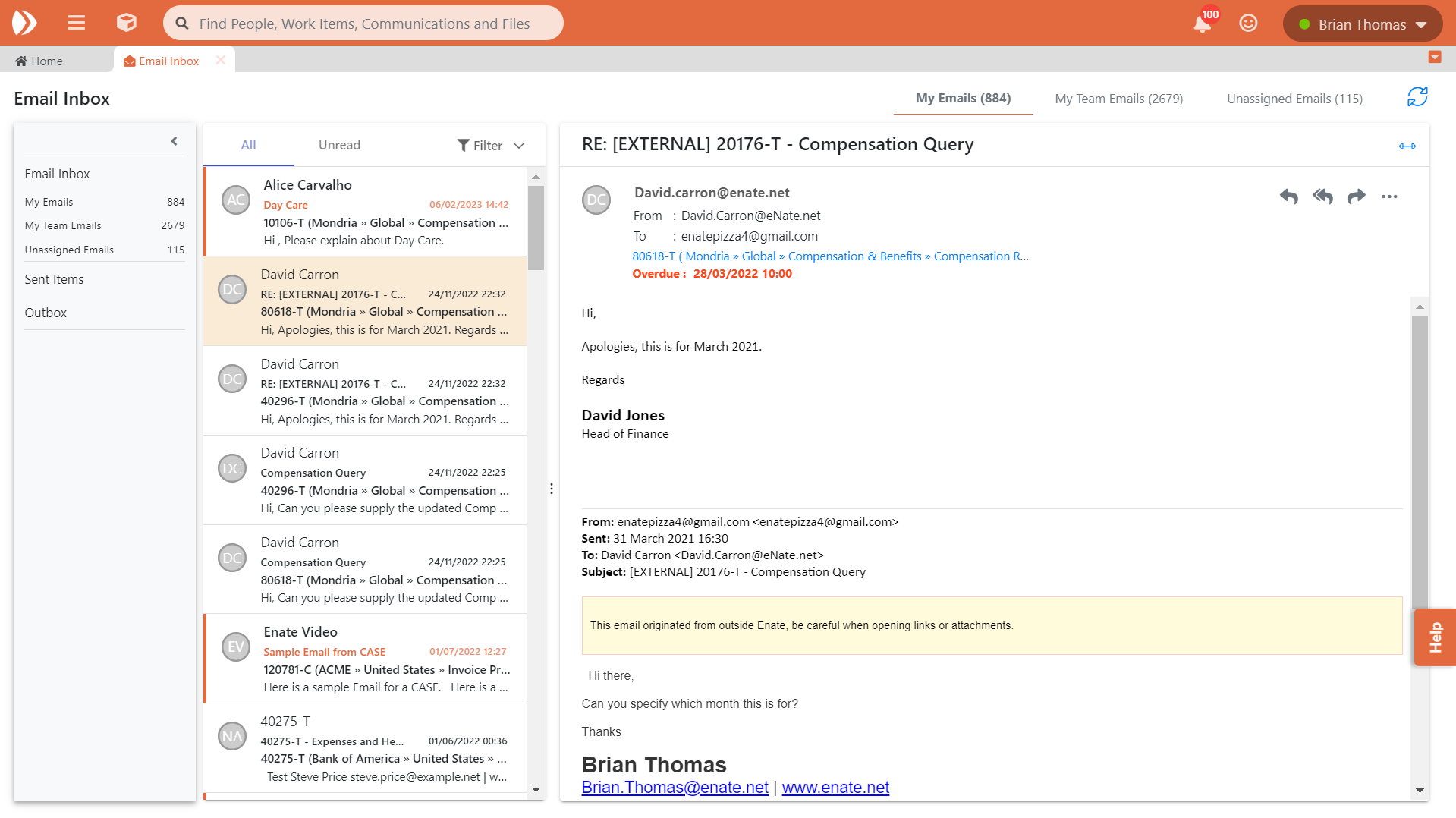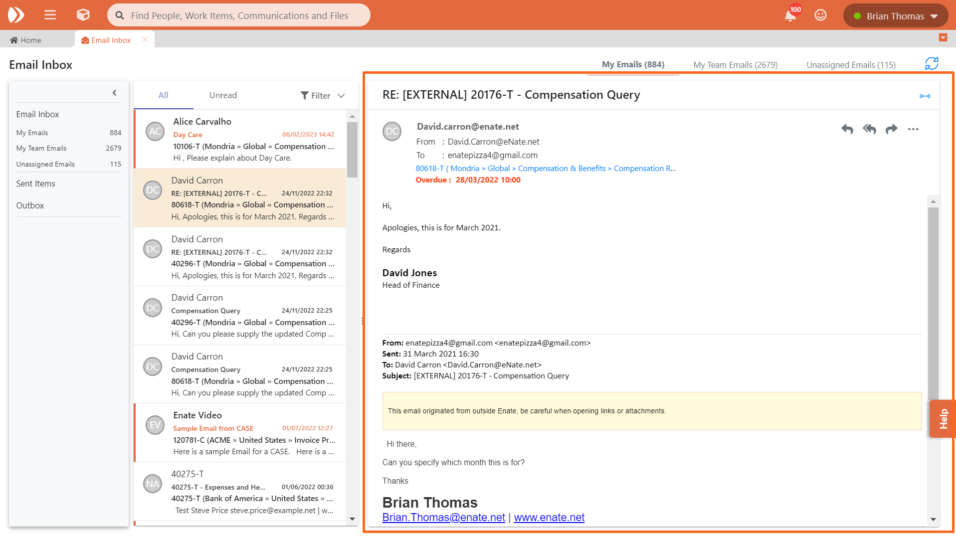 Nous avons apporté des améliorations significatives à la façon dont vous pouvez travailler avec les e-mails dans Enate en créant un tout nouvel ensemble de vues des e-mails. Elles se basent sur les vues existantes de la Boîte d'envoi pour vous donner une liste plus complète de tous les e-mails qui concernent votre domaine d'activité :