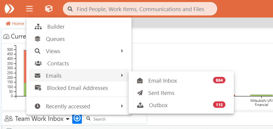 * **E-mails de mon équipe** : e-mails relatifs à toutes les activités qui se trouvent actuellement dans la boîte de réception de travail de votre équipe. Ce lien n’est visible que si vous êtes un chef d’équipe ou si vous pouvez voir vos associés et vos files d’attente.
