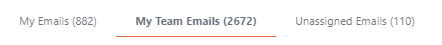 Vous pouvez basculer entre la vue « Mes e-mails » qui vous montre les e-mails dans votre propre boîte de réception, « E-mails de mon équipe » qui vous montre les e-mails dans la boîte de réception des membres de votre équipe, ou « E-mails non affectés» qui vous montre les e-mails reçus pour les activités qui n'ont pas encore été affectées dans vos files d'attente.