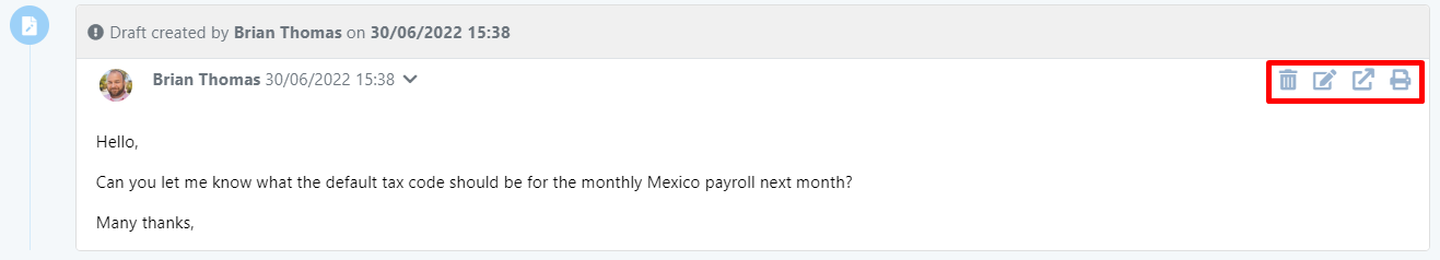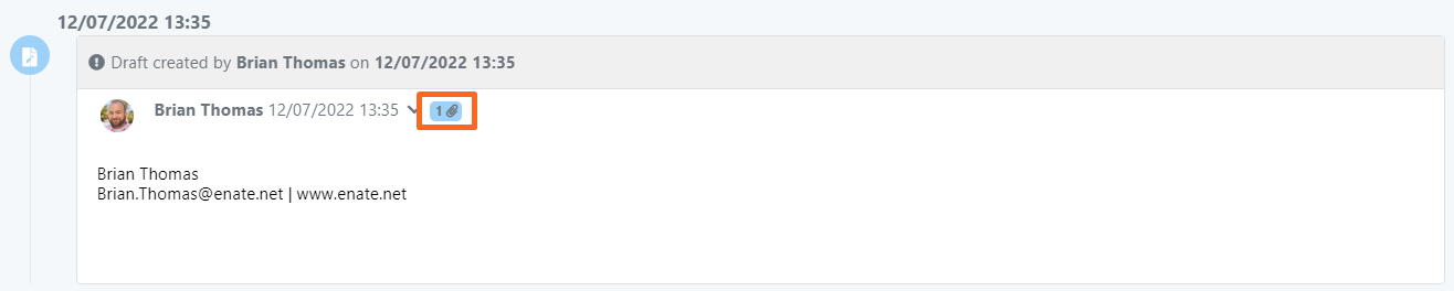Une icône pièce jointe dans l'entrée communications/chronologie du brouillon d’un e-mail vous indique si des [fichiers y ont été joints](https://docs.enate.net/enate-help/v/francais/courriels/joindre-des-fichiers-a-un-courriel).