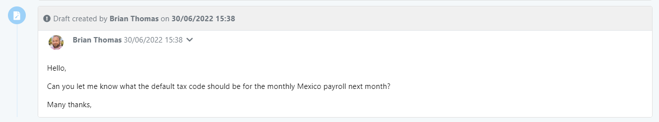 Le brouillon s’affichera dans la chronologie avec le numéro de référence de l’activité à laquelle il appartient.