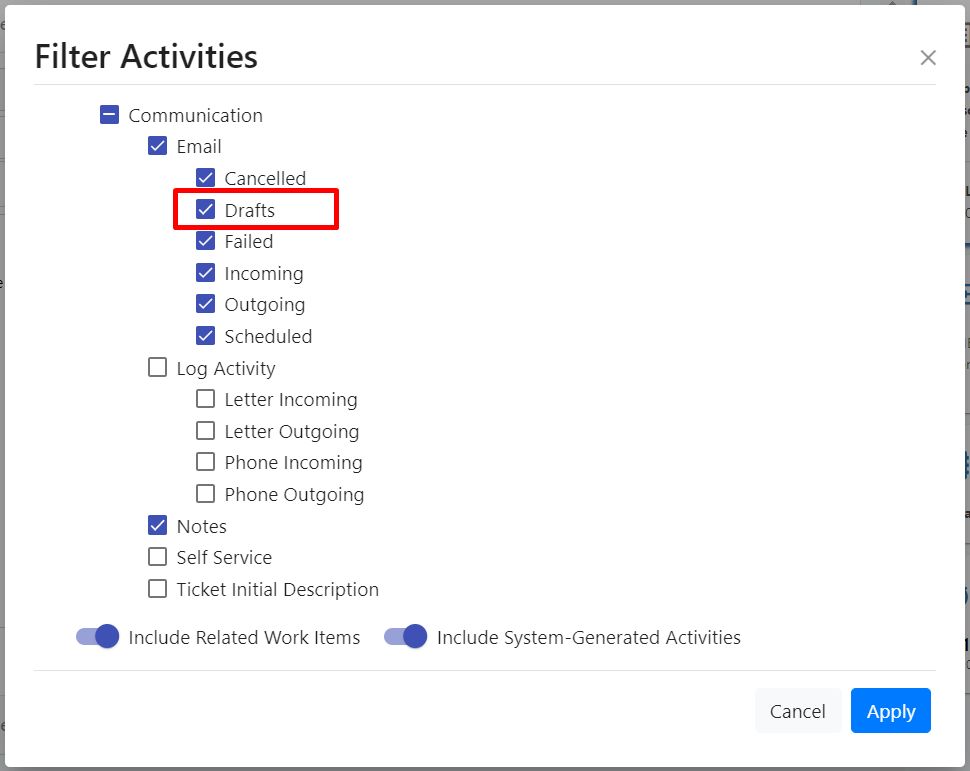 Si une activité a un brouillon d’e-mail et que vous fusionnez ou convertissez un Ticket en Cas, vous pourrez voir le brouillon dans les communications/la chronologie ou dans toutes les activités du groupe lié, à condition que les filtres « Brouillons » et « Inclure les activités liées » soient activés.
