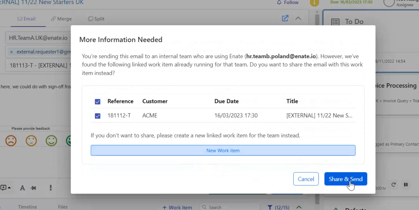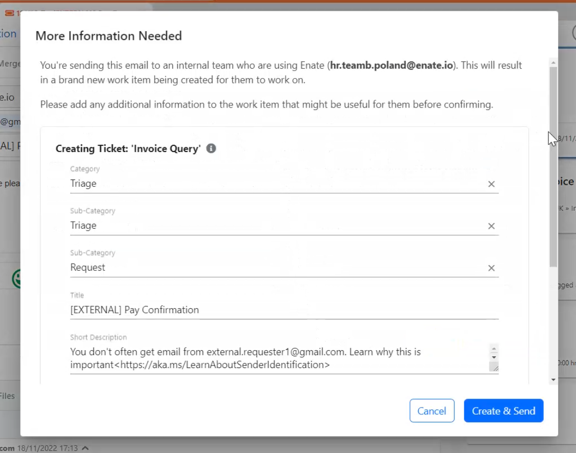 Enate sait que l’adresse e-mail de l’équipe polonaise est associée à une boîte de messagerie Enate et que l’e-mail va donc générer un ticket ou un cas pour cette équipe. Lorsque Jane clique sur *Envoyer*, Enate ouvre une fenêtre contextuelle lui expliquant la situation et lui demandant des informations supplémentaires qui l’aideront à créer l’activité pour l’autre équipe.