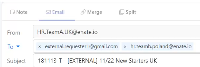 Si des e-mails sont destinés à des adresses e-mail « internes » de services de votre entreprise qui n’utilisent pas encore Enate, aucun problème, ils seront simplement envoyés en tant qu’e-mails pour communiquer avec cette autre équipe, comme cela est normalement le cas.