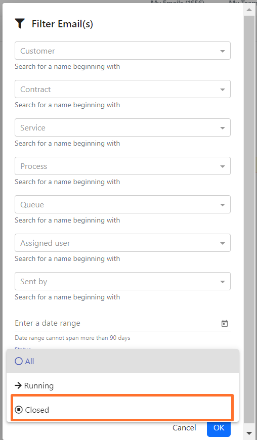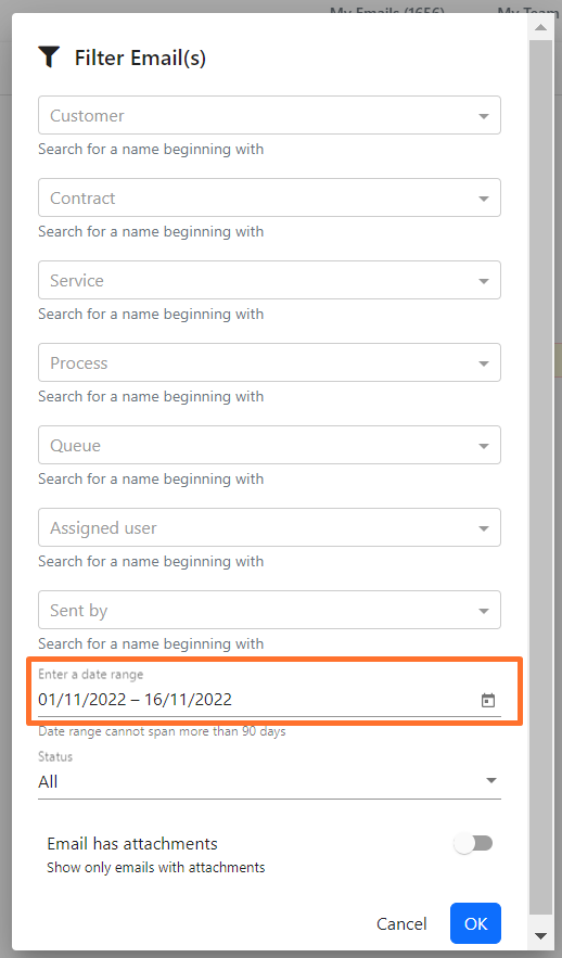 Les e-mails reçus lors des 90 DERNIERS JOURS sont affichés par défaut. Les agents peuvent utiliser la liste déroulante des filtres pour choisir une date, ou une plage de dates, différente (p. ex. plus ancienne) pour voir des e-mails plus anciens. Mais attention, la plage de dates choisie ne peut pas dépasser 90 jours.