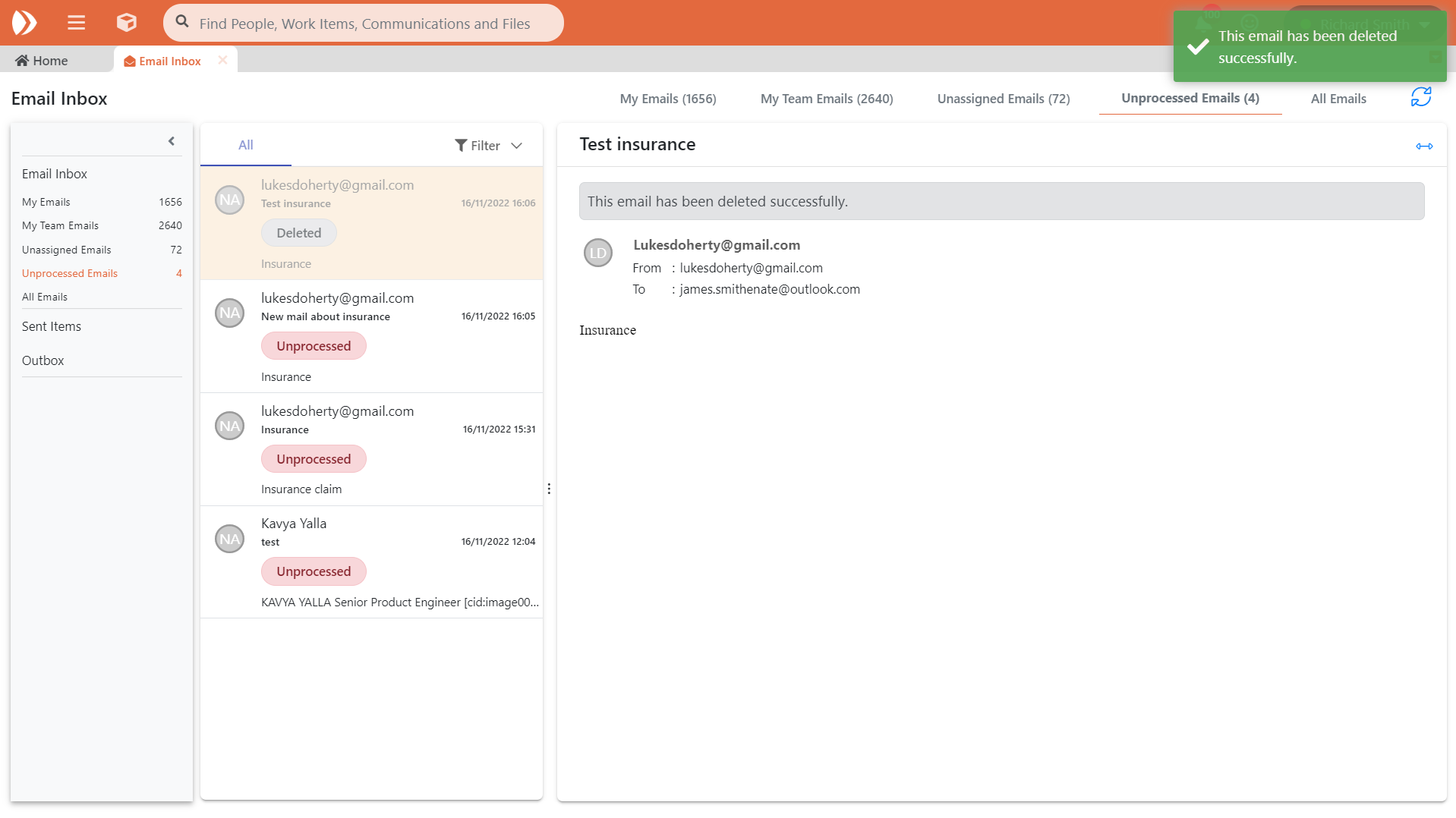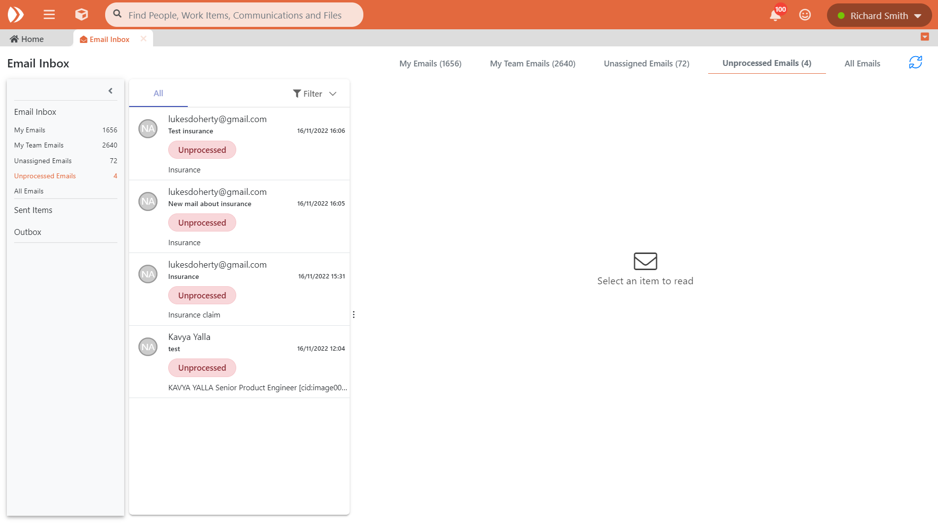 Hozzáadtunk egy új, **Feldolgozatlan e-mailek** nézetet a Work Manager e-mail-postafiók részéhez, amely lehetővé teszi az ügynökök számára eme feldolgozatlan e-mailek áttekintését, és így megtehetik a megfelelő lépéseket. Ez az opció minden felhasználó számára látható.